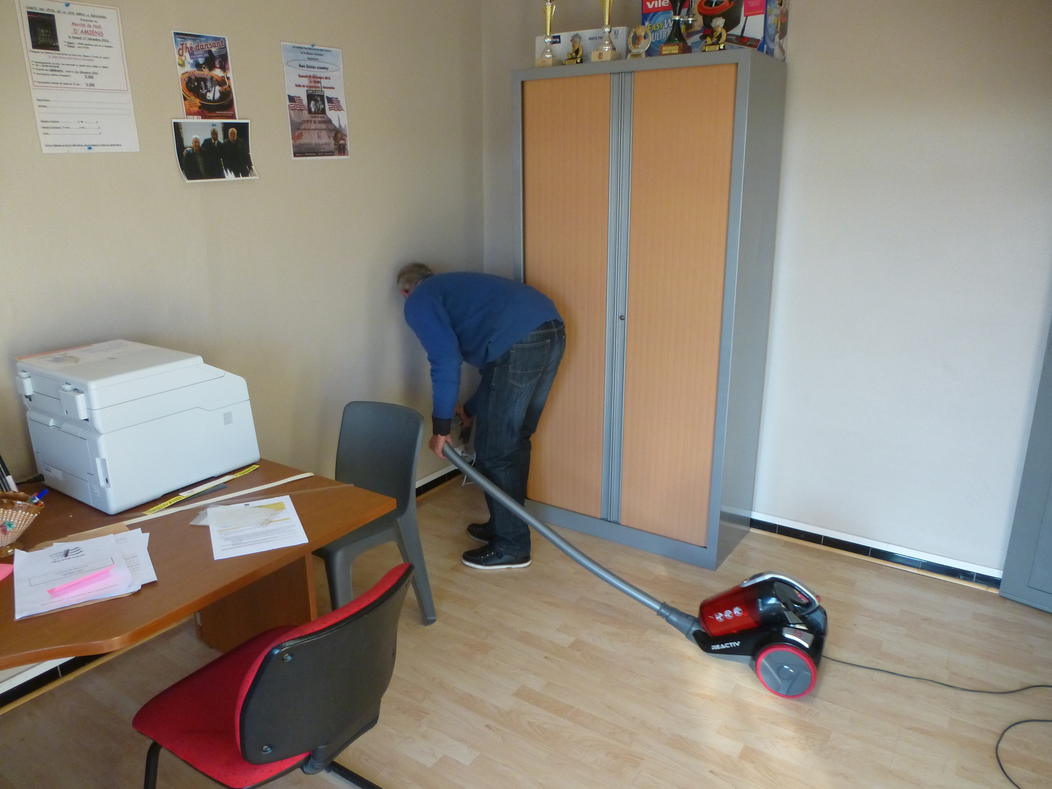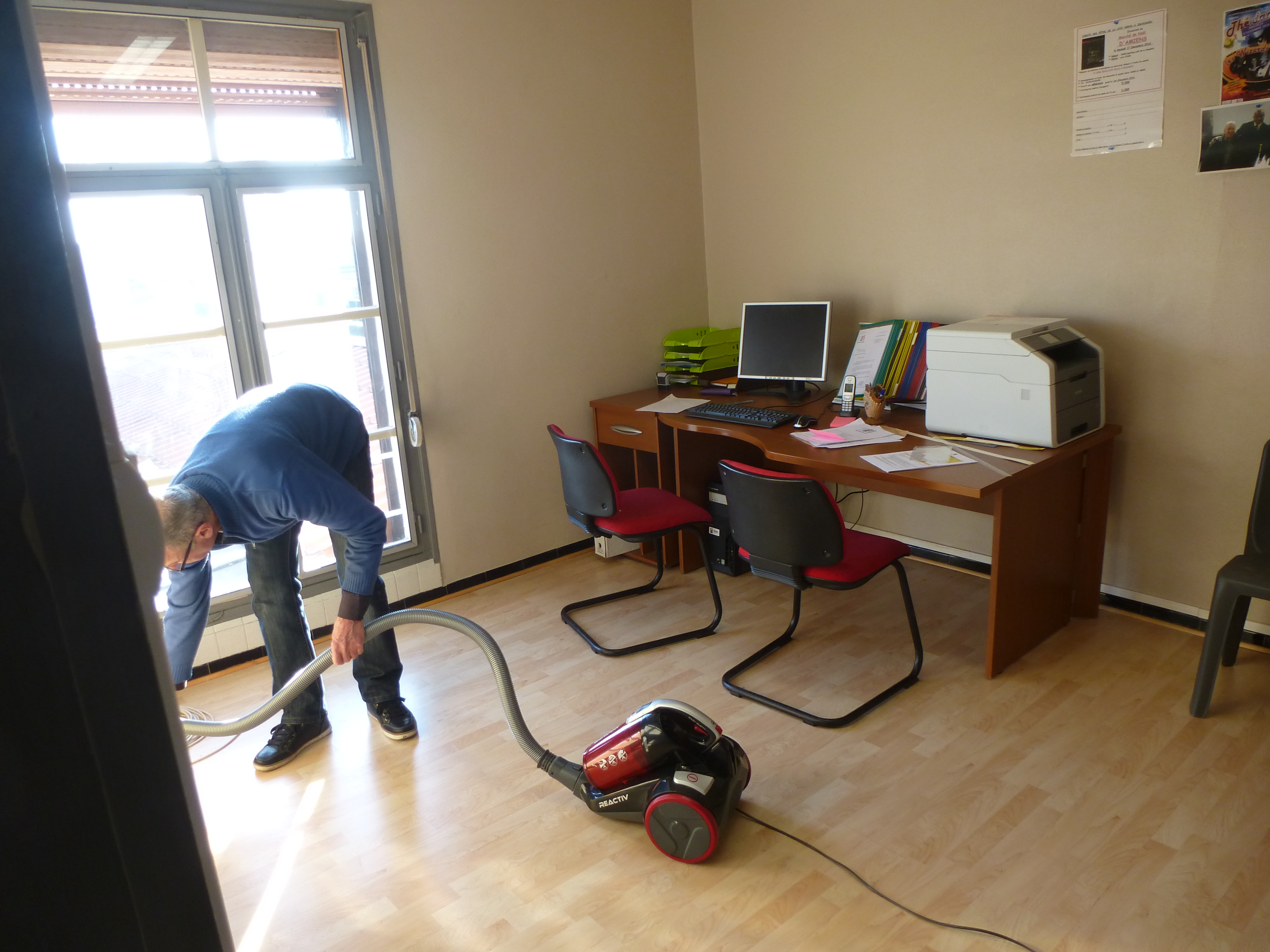 Raymond montre l’exemple: on le voit nettoyer même les petits coins dans le bureau à l’étage.