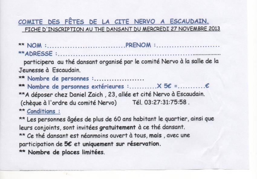 Les personnes souhaitant participer à cette fête des aînés , peuvent s’inscrire dès maintenant en renvoyant l’imprimé chez Daniel Zaich ( avec le chèque à l’ordre du comité Nervo pour les « extérieurs »).