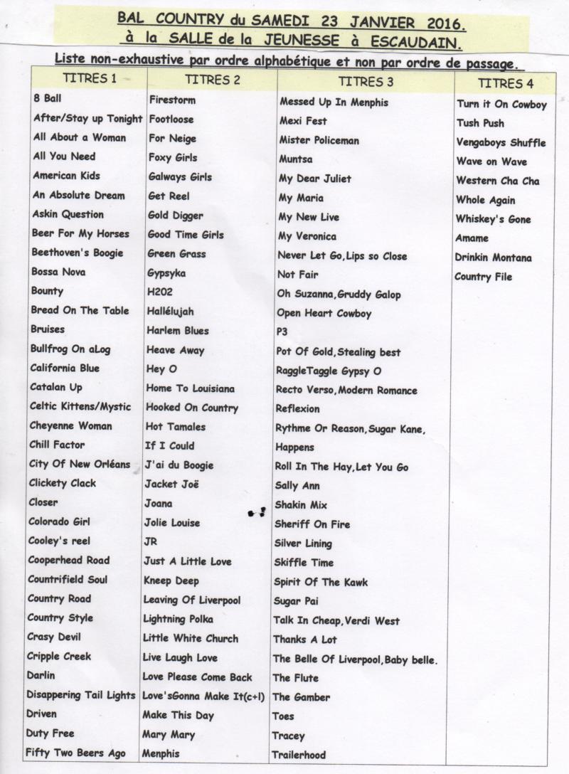 Reporté à cause des événements , et , grâce à l’intervention de Jeannette Marcuzzi, adjointe aux fêtes, le bal country aura lieu le samedi 23 janvier 2016 de 18h30 à 1h00 du matin.