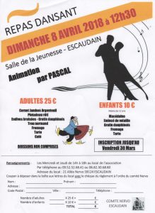 REPAS DU COMITE. Publié le 21 février 2018 par citeNervo Le traditionnel repas du comité aura lieu cette année le dimanche 8 avril 2018 à la salle de la Jeunesse à Escaudain à partir de 12h30. Ce repas sera animé par Pascal, animateur bien connu et apprécié dans le denaisis. Repas du comité.