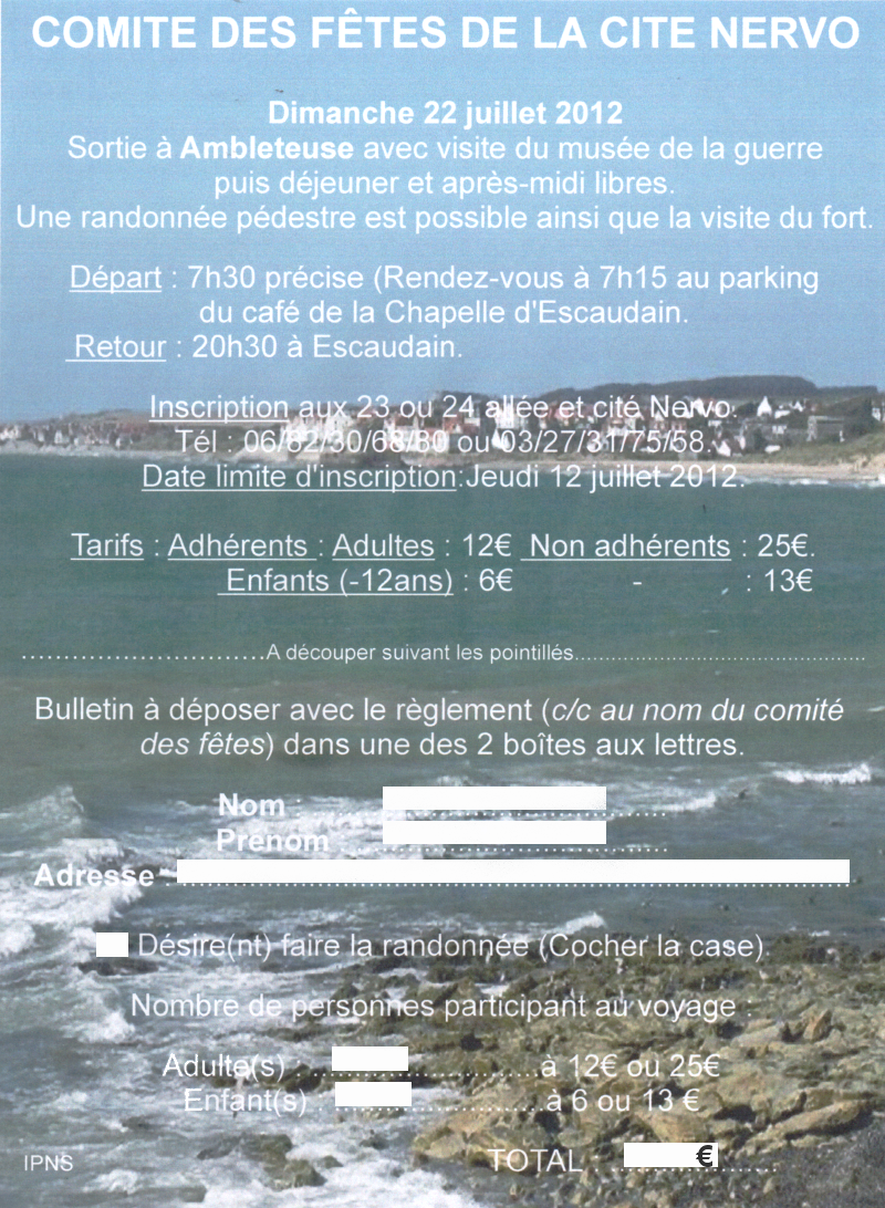 SORTIE A AMBLETEUSE LE DIMANCHE 22 JUILLET Publié le 1 juillet 2012 par citeNervo Le comité organise sa traditionnelle excursion vers la côte d’Opale le dimanche 22 juillet 2012. Avis aux amateurs !!!!!!!